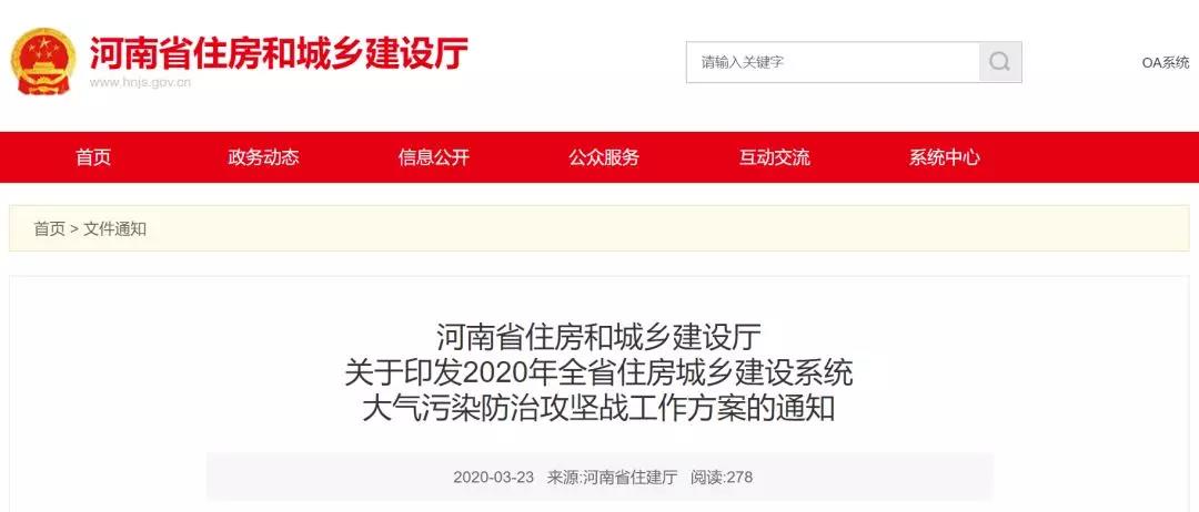 2020年3月23日,河南省住房和城鄉(xiāng)建設(shè)廳關(guān)于印發(fā)《2020年全省住房城鄉(xiāng)建設(shè)系統(tǒng)大氣污染防治攻堅(jiān)戰(zhàn)工作方案》的通知,內(nèi)容強(qiáng)調(diào):