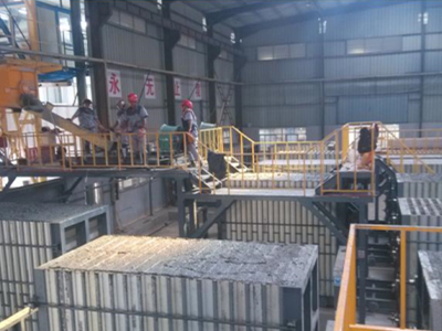 一、生產模式是由發泡攪拌計量系統、澆筑系統、模具環形輥道動力控制系統、模具成型車系統、擺渡車、出板脫模車、輕骨料提升系統等組成;